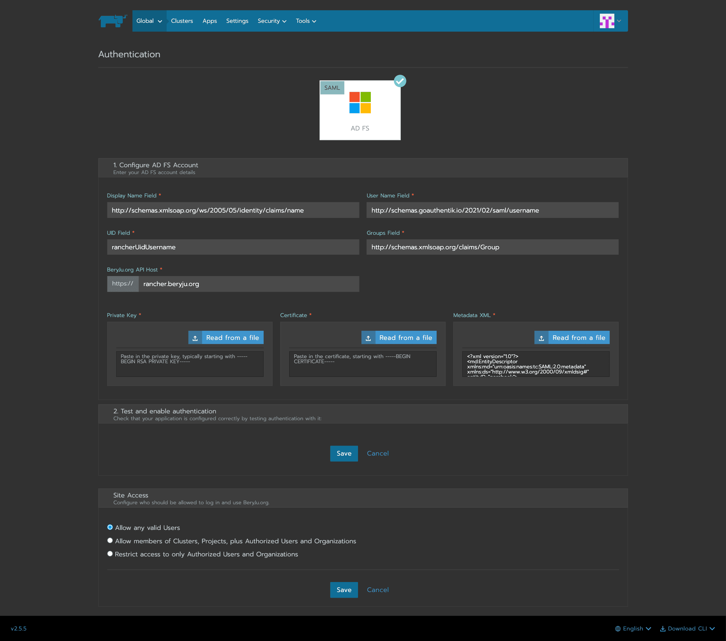 In Rancher, navigate to Global > Security > Authentication, and select ADFS.